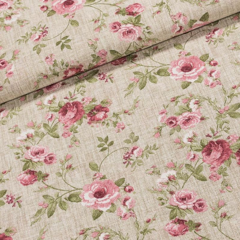 Směsové plátno VERA ROSA růže na pytlovině, růžová, š.140cm (látka v metráži)
