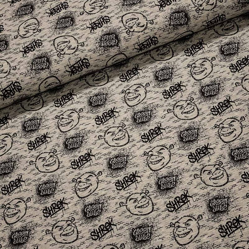 Elastický úplet (jersey) se vzorem hlavy zlobra a nápisy Shrek na šedém pozadí. Látka je v šířce 150 cm, vyrobena ze 65% bavlny, 32% polyesteru a 3% elastanu (gramáž 200g/m2). Látka je vhodná na tepláky, mikiny, čepice či nákrčníky. Látka má vzor z jedné strany z druhé je bez potisku.