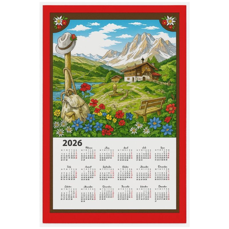Bavlněný textilní kalendář pro rok 2026 s horským prostředím s červeným okrajem v rozměru 45x65cm. Kalendář poté může sloužit i jako kuchyňská utěrka....