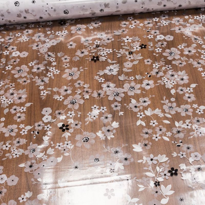 Omyvatelná PVC ubrusovina je průhledná s šedým vzorem kytiček s hladkým povrchem. Ubrus je dostupný v metráži o šířce 140cm.
