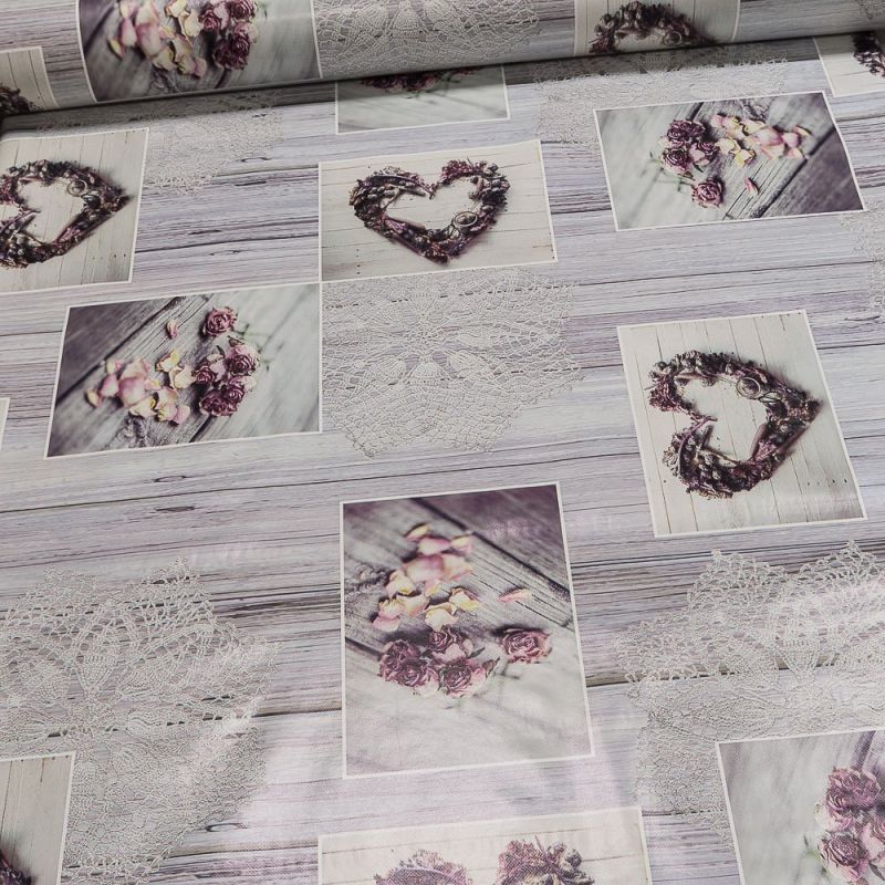 Omyvatelná PVC ubrusovina s podkladem z netkané textilie se vzorem srdíček vyrobených z růží a krajky na dřevěném podkladu s hladkým povrchem. Ubrus je dostupný v metráži o šířce 140cm.