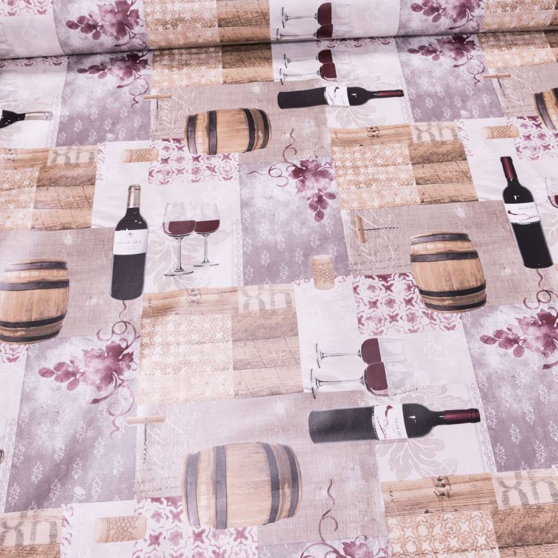 Omyvatelná PVC ubrusovina s podkladem z netkané textilie se vzorem vína a soudků v kombinaci se dřevem ve hnědých a vínových barvách s hladkým povrchem. Ubrus je dostupný v metráži o šířce 140cm.