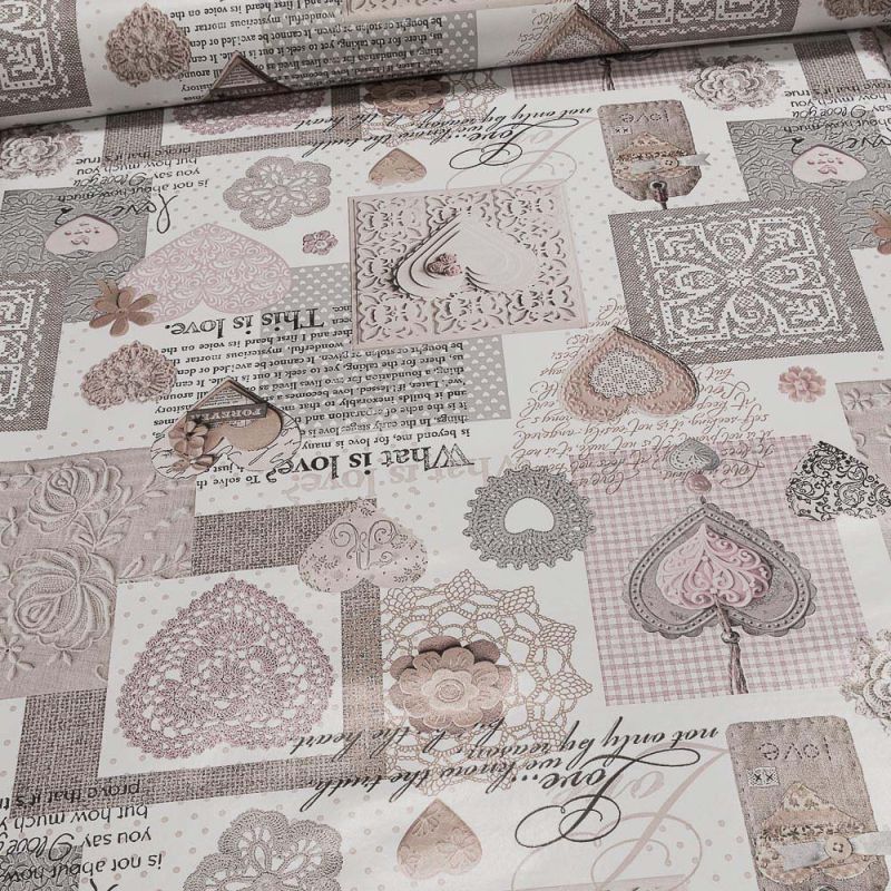 Omyvatelná PVC ubrusovina s podkladem z netkané textilie, se vzorem krajky a srdíček v patchworkovém provedení ve starorůžové barvě. Ubrus je dostupný v metráži o šířce 140 cm s hladkým povrchem.