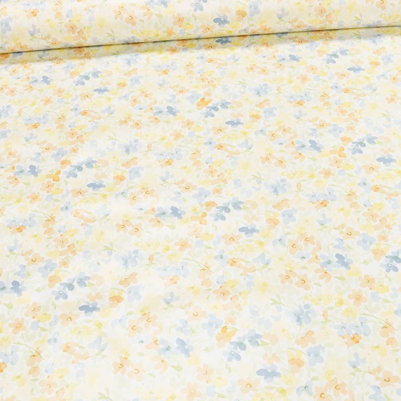 Omyvatelná PVC ubrusovina s podkladem z netkané textilie s jemným vzorem lososových, modrých a žlutých květů, jako by byly malované vodovými barvami s hladkým povrchem. Ubrus je dostupný v metráži o šířce 140cm.