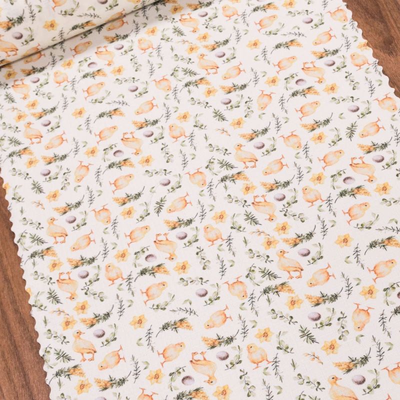 Látková ubrusovina / štola s vodoodpudivou teflonovou vrstvou se vzorem kuřátek, kachniček, vajíček a květin na smetanovém podkladu s vlnkovanými okraji. Díky teflonové vrstvě se rozlité tekutiny do ubrusu nevsáknou a dají se snadno setřít ubrouskem (neplatí však pro mastnotu). Ubrusovina je vyrobena ze 100% polyesteru a je dostupná v metráži o šířce 38cm, takto široká ubrusovina má využití jako středový pás na stůl nebo také prostírání.