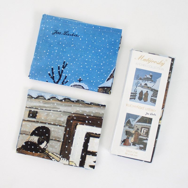Bavlněné utěrky s motivem zimy a vánočního Štědrého večera v typické kresbě Josefa Lady v modro-bílém provedení v rozměru 50x64cm. Utěrky mají jednost...