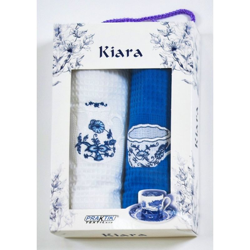 Utěrky KIARA 142 vaflové vyšívané, dárkové balení, hrníček a konvička, modro-bílá, 2 kusy 50x70cm