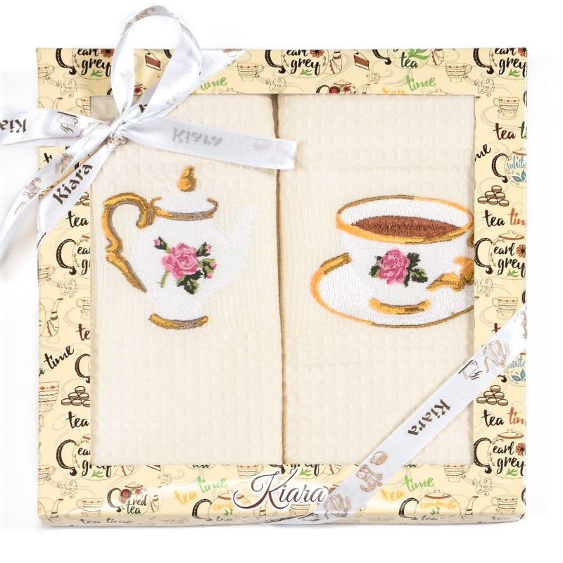 Bavlněné vaflové utěrky se vzorem konvičky a hrníčku s růžičkou na smetanovém podkladu. Balení obsahuje 2 kusy utěrek v rozměru 50x70cm. Utěrky jsou baleny v ozdobné dárkové krabičce a jsou vyrobeny ze 100% bavlny.