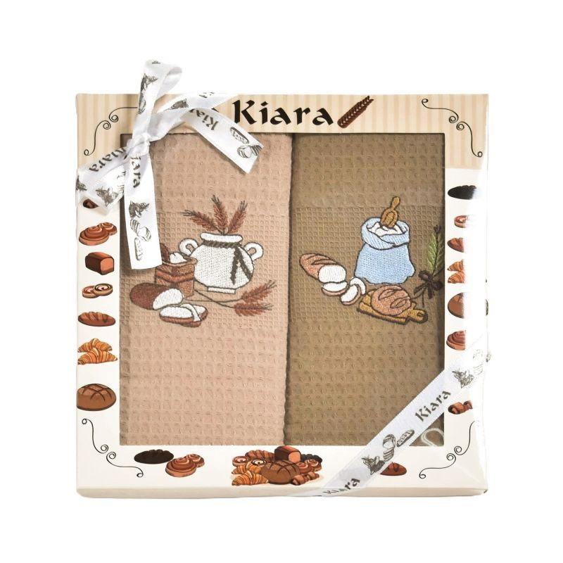 Utěrky KIARA 160 vaflové vyšívané, dárkové balení, modrý pytel a pečivo na tmavě béžové, 2 kusy 50x70cm