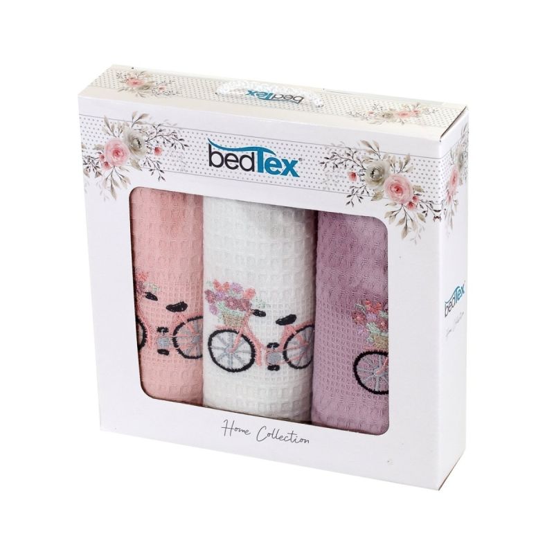 Bavlněné vaflové utěrky s motivem vyšívaného kola na růžovém a bílém podkladu. Balení obsahuje 3 kusy utěrek v rozměru 40x60cm. Utěrky jsou baleny v ozdobné dárkové krabičce a jsou vyrobeny ze 100% bavlny.