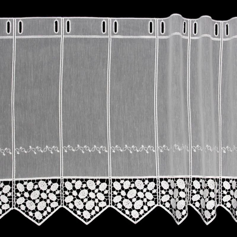 Metrážová voálová vitrážová záclona se vzorem vyšívaných oválků na smetanové zakončená špičkami, ve vrchní části s oky na zavěšení na tyč. Záclona je vyrobena ze 100% polyesteru a je dostupná v různých výškách. Výška záclony je měřena v nejdelším místě, je vyrobená do panelů v šířce cca 15cm a po zastřižení má zapravené okraje.