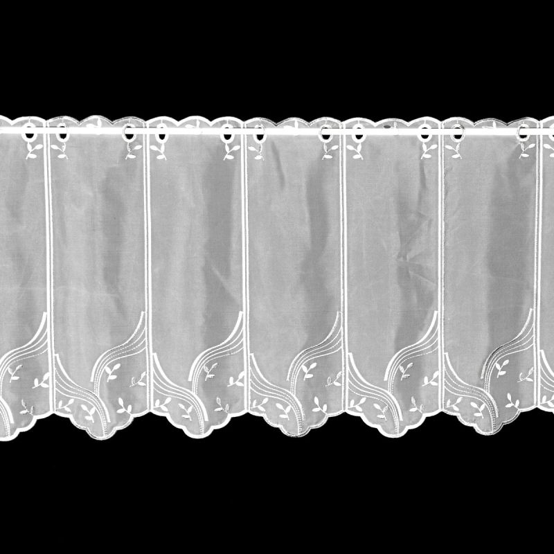 Metrážová voálová vitrážová záclona s šedými vyšívanými lístky na bílém podkladě, s bordurou zakončenou obloučky. Záclona je vyrobena ze 100% polyeste...