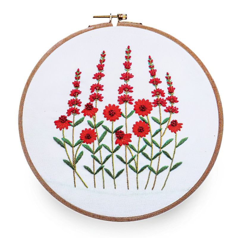 Sada na vyšívání s motivem červených květů. Vyšívá se na předtištěnou tkaninu pomocí příze mouline (mulinka). Vyšívací sada obsahuje vyšívací tkaninu s předlohou, sadu barevných přízí, obrázkový návod a vyšívací jehly. Rozměr samotného obrázku je 14,2 x 16,3 cm. Dodáváno v dárkovém balení v podobě tvrdé, papírové obálky o rozměru 15 x 22 cm. Vyšívací kruh není součástí balení. Lze použít kruhy o průměru max. cca 22 cm.
