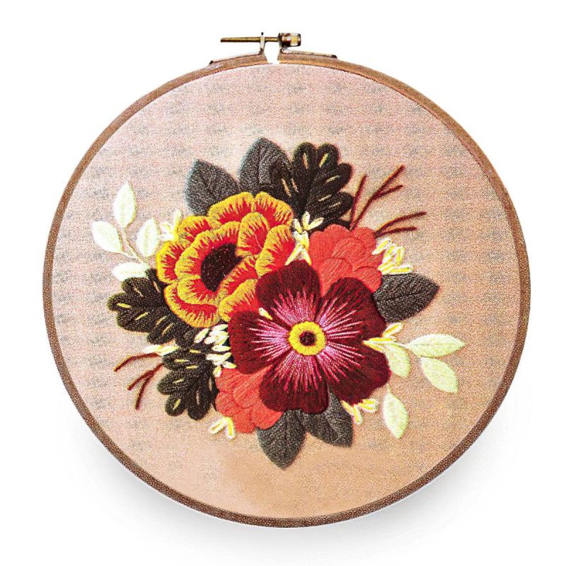 Sada na vyšívání s motivem barevné kytice na režné. Vyšívá se na předtištěnou tkaninu pomocí příze mouline (mulinka). Vyšívací sada obsahuje vyšívací tkaninu s předlohou, sadu barevných přízí, obrázkový návod a vyšívací jehly. Rozměr samotného obrázku je 15 x 16 cm. Dodáváno v dárkovém balení v podobě tvrdé, papírové obálky o rozměru 15 x 22 cm. Vyšívací kruh není součástí balení. Lze použít kruhy o průměru max. cca 22 cm.