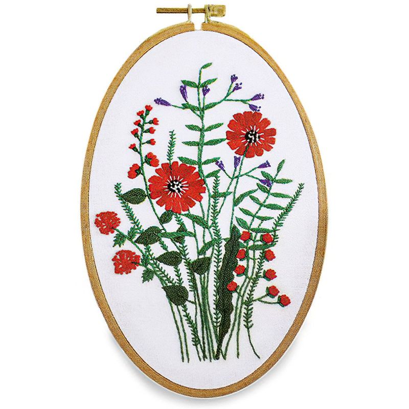 Sada na vyšívání s motivem červeného lučního kvítí. Vyšívá se na předtištěnou tkaninu pomocí příze mouline (mulinka). Vyšívací sada obsahuje vyšívací tkaninu s předlohou, sadu barevných přízí, obrázkový návod a vyšívací jehly. Rozměr samotného obrázku je 10,8 x 17,3 cm. Dodáváno v dárkovém balení v podobě tvrdé, papírové obálky o rozměru 15 x 22 cm. Vyšívací kruh není součástí balení. Lze použít kruhy v oválném tvaru o rozměru max. cca 16 x 23 cm.
