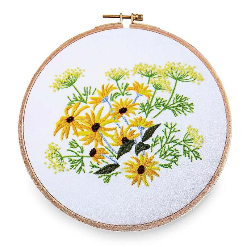 Sada na vyšívání s motivem žlutého lučního kvítí. Vyšívá se na předtištěnou tkaninu pomocí příze mouline (mulinka). Vyšívací sada obsahuje vyšívací tkaninu s předlohou, sadu barevných přízí, obrázkový návod a vyšívací jehly. Rozměr samotného obrázku je 15 x 16 cm. Dodáváno v dárkovém balení v podobě tvrdé, papírové obálky o rozměru 15 x 22 cm. Vyšívací kruh není součástí balení. Lze použít kruhy o průměru max. cca 22 cm.