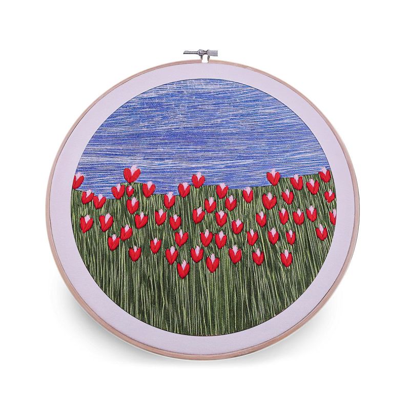 Sada na vyšívání s motivem vlčích máků na louce s modrou oblohou. Vyšívá se na předtištěnou tkaninu pomocí příze mouline (mulinka). Vyšívací sada obsahuje vyšívací tkaninu s předlohou, sadu barevných přízí, obrázkový návod, vyšívací jehly a dřevěný, bambusový vyšívací kruh o průměru 26,5cm, který použijete jako rámeček pro hotový obrázek.