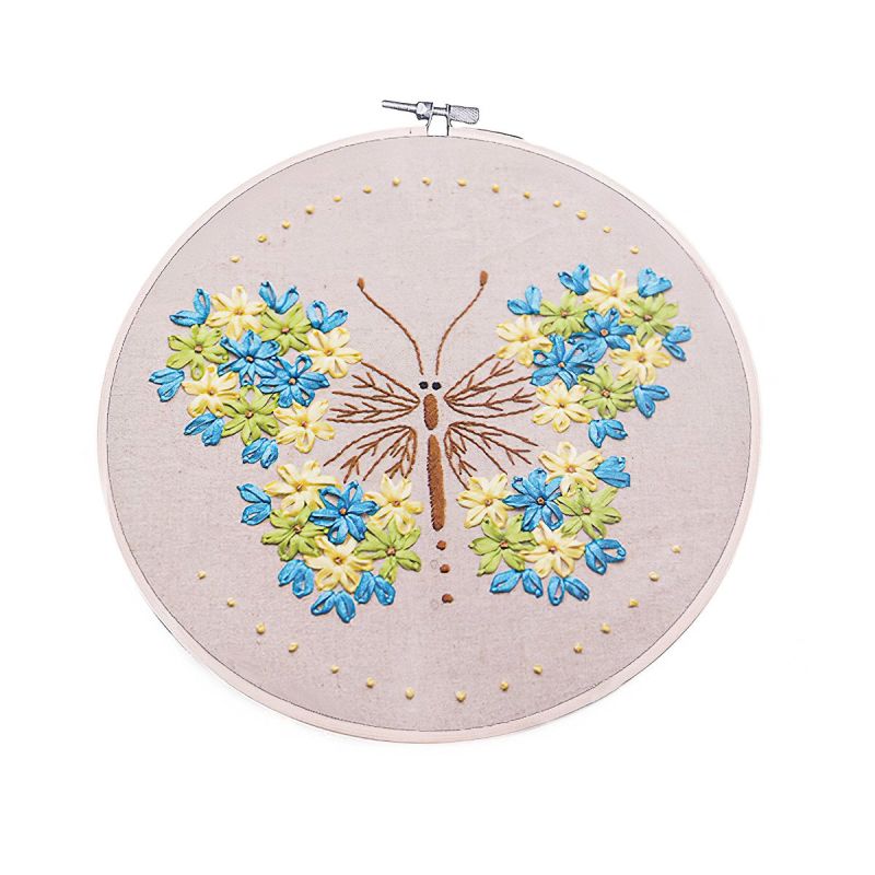 Sada na vyšívání s motivem žlutých a modrých květů tvořících vzor motýla. Vyšívá se na předtištěnou tkaninu pomocí příze mouline (mulinka). Vyšívací sada obsahuje vyšívací tkaninu s předlohou, sadu barevných přízí a stužek, obrázkový návod, vyšívací jehly a dřevěný, bambusový vyšívací kruh o průměru 26,5cm, který použijete jako rámeček pro hotový obrázek.