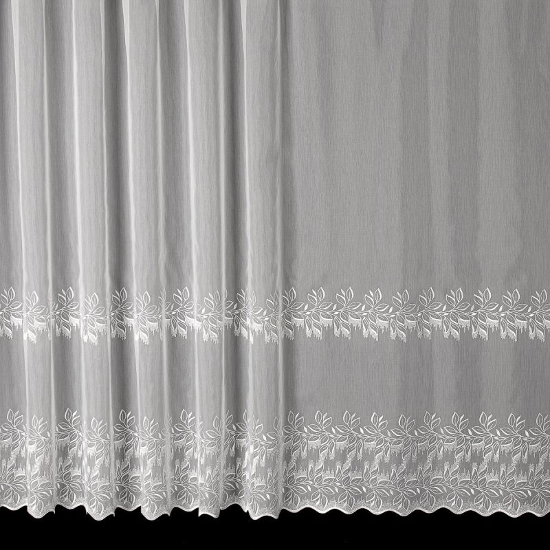 Metrážová batistová záclona s bílým vyšívaným vzorem listů ve dvou řadách na bílém podkladě, zakončená bordurou. Záclona je vyrobena ze 100% polyester...