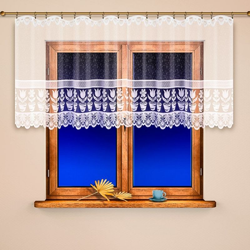 Metrážová žakárová vitrážová záclona se vzorem kytek v květináčích na bílém podkladu. Záclona je vyrobena ze 100% polyesteru a je dostupná v různých v...