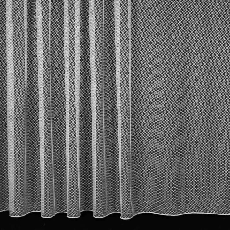 Metrážová žakárová záclona v bílé barvě se vzorem hrubého kára, zakončená zátěžovým olůvkem. Záclona je vyrobena ze 100% polyesteru a je dostupná v různých výškách. Výška záclony je měřena v nejdelším místě.