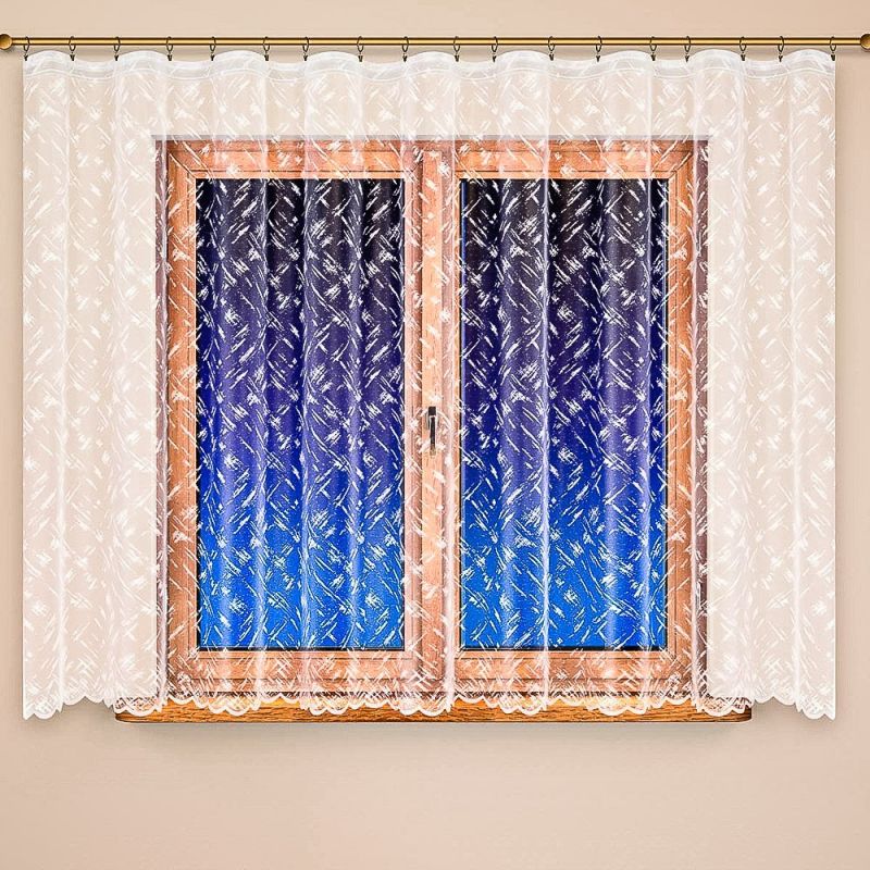 Metrážová jemná žakárová záclona v bílé barvě s moderních geometrickým vzorem, zakončená bordurou. Záclona je vyrobena ze 100% polyesteru a je dostupná v různých výškách. Výška záclony je měřena v nejdelším místě.