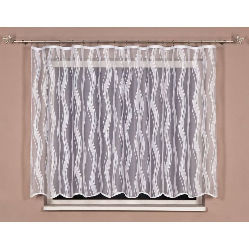 Metrážová žakárová záclona se vzorem vlnek v bílé barvě, zakončená bordurou. Záclona je vyrobena ze 100% polyesteru a je dostupná v různých výškách. Výška záclony je měřena v nejdelším místě.