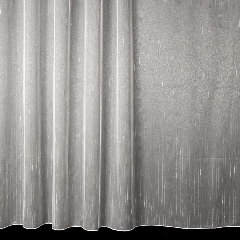 Metrážová jemná žakárová záclona se vzorem bílých nopků v jednobarevné bílé barvě zakončená zátěžovým olůvkem. Záclona je vyrobena ze 100% polyesteru a je dostupná v různých výškách. Výška záclony je měřena v nejdelším místě.